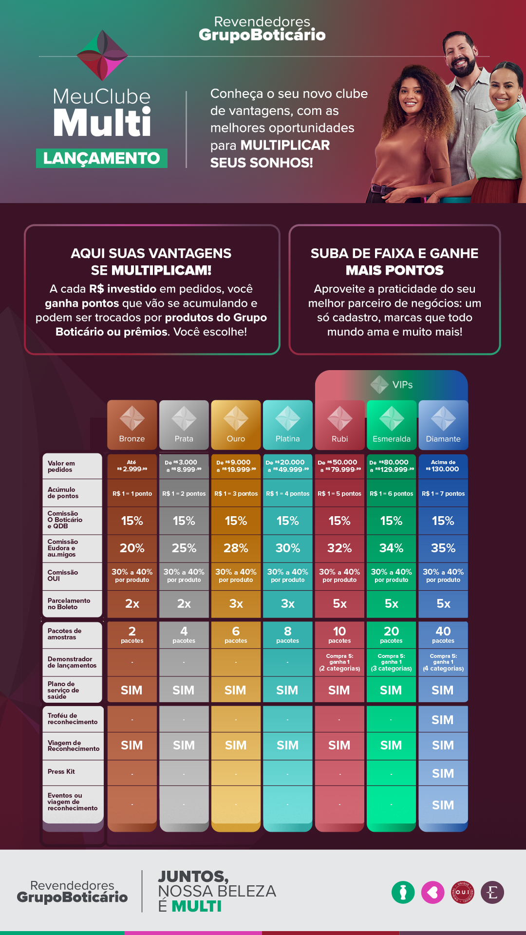 O Meu Clube Multi é o seu novo clube de vantagens. Agora, ainda melhor, mais flexível e com mais oportunidades para o seu crescimento. Acumule pontos a cada compra e troque-os por produtos do Grupo Boticário ou prêmios, você escolhe! Aqui, suas vantagens se multiplicam e quanto mais você vende, mais você ganha!